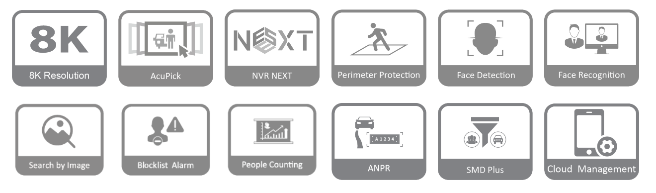Resolutsioon: Toetab IP-kaameraid kuni 32 MP resolutsiooniga ning 8K HDMI väljundit.